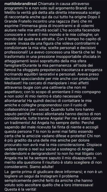 In sostanza, come potete leggere nello screen sottostamte, Matilde Brandi ha rivelato come dopo il Grande Fratello una sua fan voleva aiutarla nelle sue attività social. Lei l’ha accolta ma a quanto pare questa persona avrebbe avuto dei secondi fini, creandole problemi in famiglia e non solo. Peraltro pare che questa persona si sarebbe permessa di parlare a nome suo quando Matilde era impegnata a L’Isola.