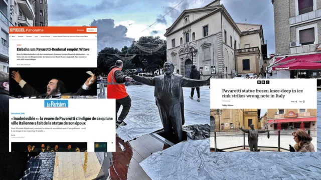 La statua di Pavarotti della pista di pattinaggio “tombata” fino alle ginocchia, ha scatenato un vortice mediatico sorprendente...