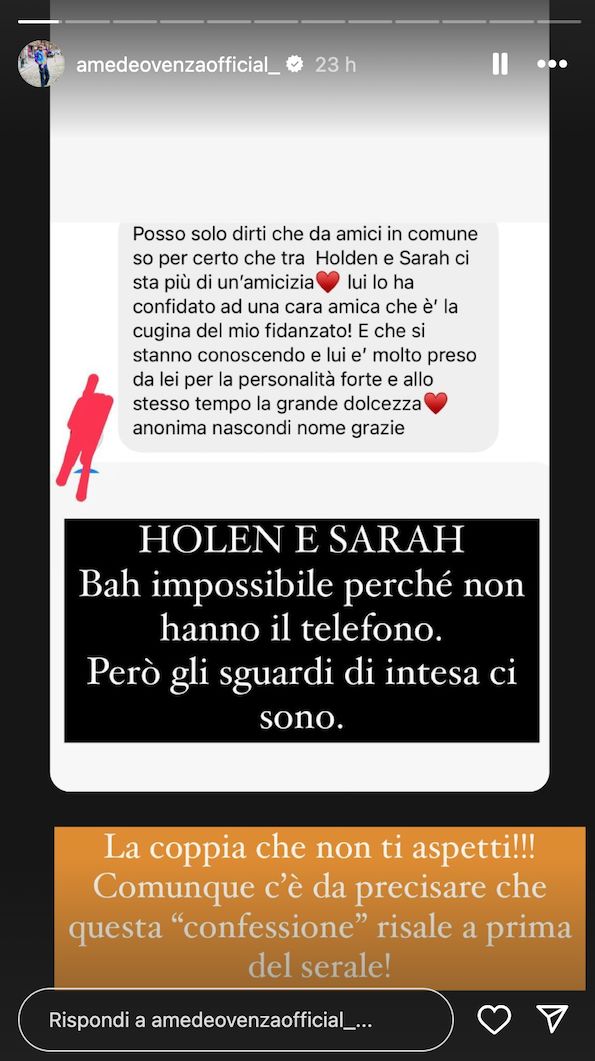 Stando a quanto si legge, i due protagonisti di Amici 23 sarebbero sempre più vicini. Ma non solo. L’utente in questione infatti sostiene di conoscere persone legate a Holden, che avrebbero riportato alcune sue confessioni. Pare infatti che Joseph sia molto preso da Sarah, al punto da aver confidato a un’amica il suo interesse per la cantante.