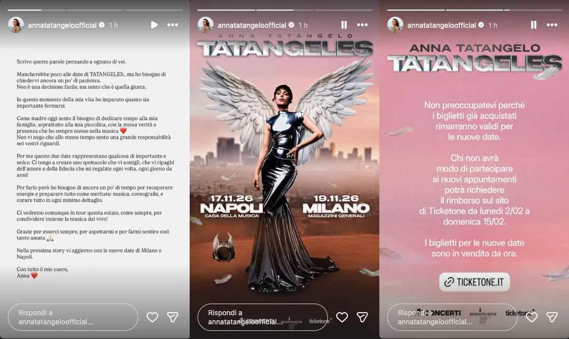 A quel punto Anna Tatangelo ha confidato al suo pubblico che nulla sarebbe andato perduto, annunciando così i nuovi appuntamenti e spiegando anche che coloro che hanno già acquistato i biglietti non avranno bisogno di effettuare un nuovo ordine.