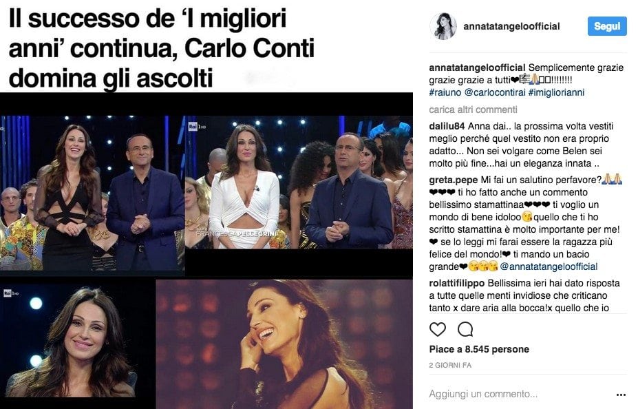 Il post di Anna Tatangelo con i ringraziamenti per la serata