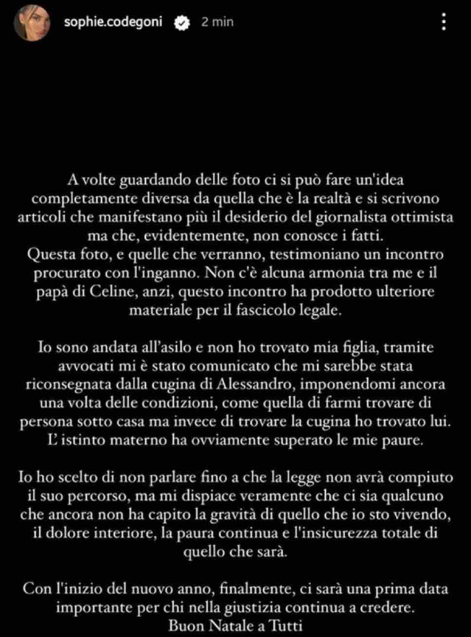 Sulla rivista il giornalista ha raccontato che, a quanto pare, Sophie Codegoni e Alessandro Basciano si sarebbero rivisti per la figlia che hanno insieme, Céline Blue. Nel servizio si fa presente che nulla impedisce al deejay di poterla incontrare e non ci sarebbe alcun provvedimento che lo vieti. Nel racconto è stato descritto il pomeriggio tra nido, passeggiata al parco, shopping e merenda, prima del ritorno a casa: