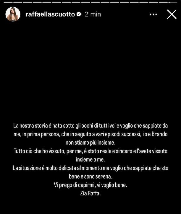 “La nostra storia è nata sotto gli occhi di tutti voi e voglio che sappiate da me, in prima persona, che in seguito a vari episodi successi io e Brando non stiamo più insieme. Tutto ciò che ho vissuto, per me, è stato reale e sincero e l’avete vissuto insieme a me. La situazione è molto delicata al momento ma voglio che sappiate che sto bene e sono serena. Vi prego di capirmi, vi voglio bene”.