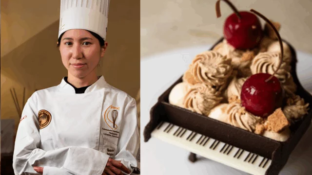 Oro Giappone: Aya Okada Tiramisù a forma di pianoforte a coda, con ciliegie Maraschino e Amarena. Estetica da standing ovation e gusto sublime!