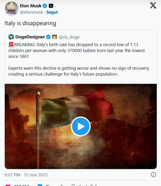 Dietro questa immagine forte e provocatoria si cela un dato concreto, certificato da fonti ufficiali: secondo ISTAT, nel 2024 in Italia sono nati solo 370 000 bambini — il numero più basso dal 1861 — e il tasso di fecondità medio si è attestato intorno a 1,18 figli per donna, ben al di sotto della soglia di 2,1 necessaria per il semplice ricambio generazionale. Musk non è nuovo a lanciare allarmi demografici; già in passato aveva commentato la situazione italiana definendola «la più grande minaccia alla civiltà».