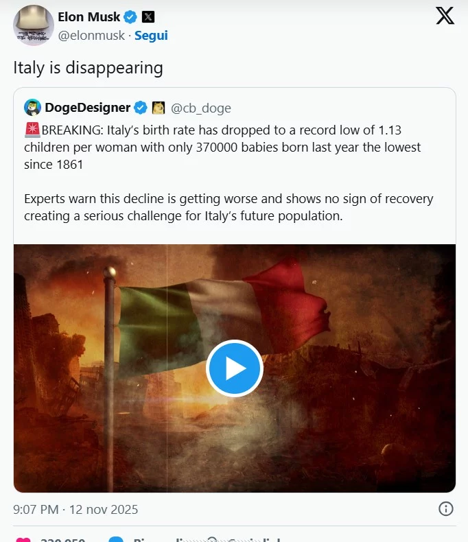 È accaduto in una frazione di secondo: Elon Musk ha rilanciato sul suo profilo X un post sulla crisi demografica italiana, accompagnato da un’immagine forte e simbolica: la bandiera italiana in fiamme. Il messaggio recita lapidario «Italy is disappearing» («L’Italia sta scomparendo») ed è subito diventato virale, suscitando reazioni che oscillano tra allarme, indignazione e interrogativi sul futuro del Paese.