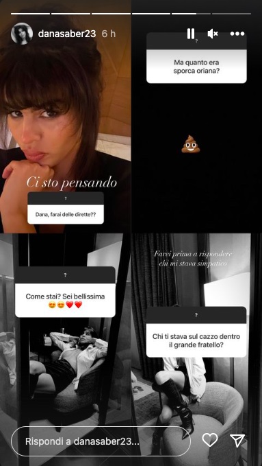 Nelle prima prima storia pubblicata ha confermato per prima cosa il suo account, oltre a rivelare la data di nascita e com’è stato il suo rientro a casa. Ma a colpire è stata una risposta data da Dana Saber. Qualcuno le ha chiesto chi sono per lei le persone più false e lei ha risposto: “Luca Onestini“.