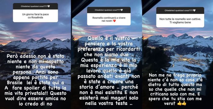 “Se un giorno farò pace con Rosalinda? Per adesso non è stata niente e non mi aspetto niente da questa persona. Anzi appena sono partita per il Brasile lei è stata qui a fare spoiler di tutta la mia vita privata. Questo vuol dire essere mia amica? Io credo di no”.