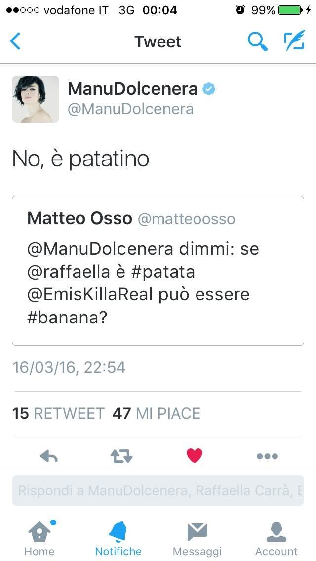 Ma c’è chi si è meritato un appellativo tutto suo: interrogata dal sottoscritto via Twitter @Manudolcenera non ha tardato a rispondere. La domanda era: se Raffaella è patata, Emis Killa può essere banana?