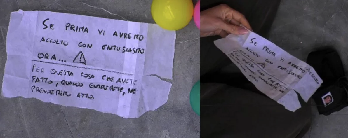 Durante la divisione tra “casalinghi” e “tuguriati”, Jonas ha scritto un bigliettino ai nuovi inquilini del GF, dopo aver scoperto che questi avevano “rubato” alcune provviste. Un messaggio scritto senza giri di parole e… grammaticalmente discutibile: