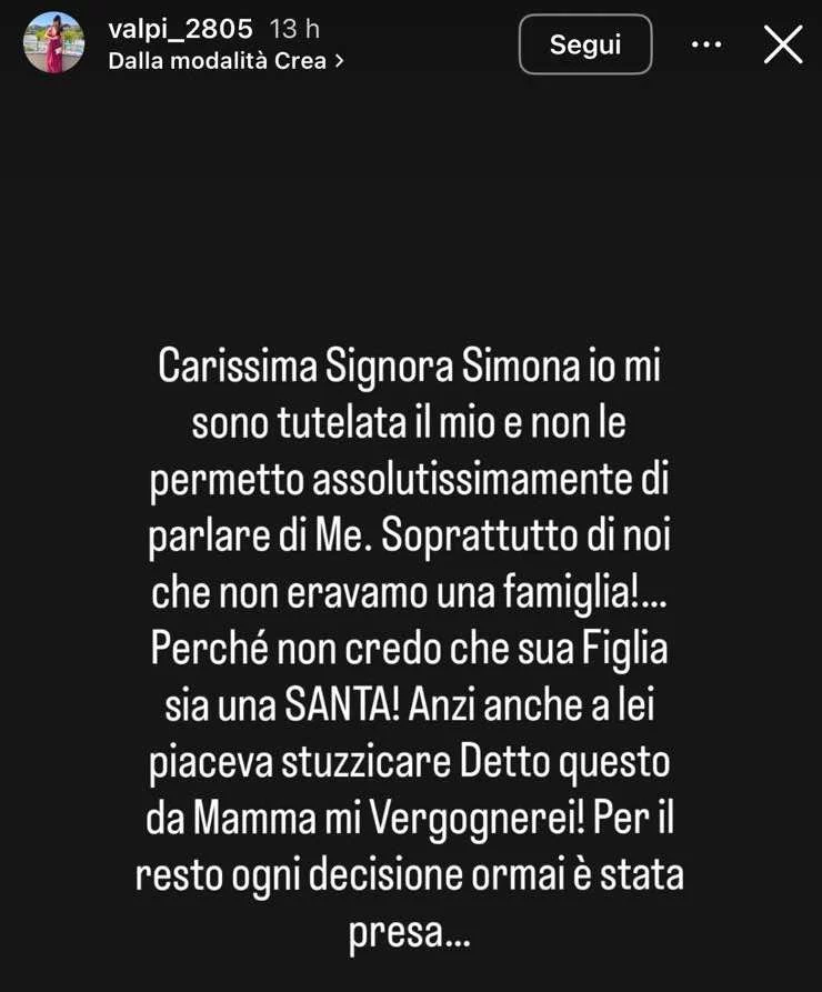 “Carissima signora Simona. Io mi sono tutelata e non le permetto di parlare di me. Non credo che sua figlia sia una santa. Anche a lei piaceva stuzzicare. Da mamma mi vergognerei. Per il resto, ogni decisione è stata presa.”