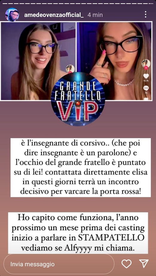 Secondo quello che riporta Amedeo Venza infatti pare che a far parte del cast del GF Vip 7 possa esserci nientemeno che Elisa Esposito, la nota prof di corsivo che da settimane è diventata una vera e propria star del web. Stando a quello che riporta Venza, pare che gli autori del reality abbiano puntato gli occhi sull’influencer. Ma non solo. Sembrerebbe anche che nei prossimi giorni ci sarà un incontro decisivo durante il quale verrà stabilito il destino di Elisa.