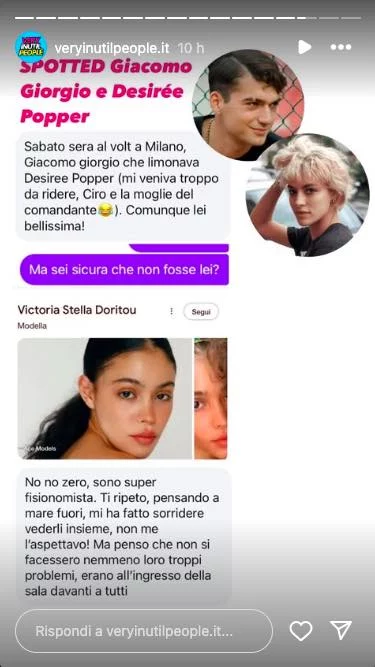 Il profilo di Very Inutil People ha dunque domandato se la persona in questione fosse davvero sicura si trattasse dell’attrice e non della modella Victoria Stella Doritou, con cui peraltro Giacomo Giorgio è stato pizzicato recentemente.