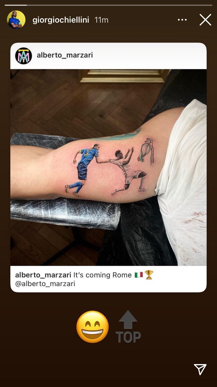 Come se non bastasse in queste ore proprio un tifoso ha deciso di tatuarsi il momento in cui Giorgio Chiellini ha trattenuto Bukayo Saka per la maglia, e lo scatto ha fatto il giro del web. Ma non solo. Il difensore azzurro infatti ha anche condiviso sui suoi social il tatuaggio già iconico, e non è mancata la sua reazione di stupore.