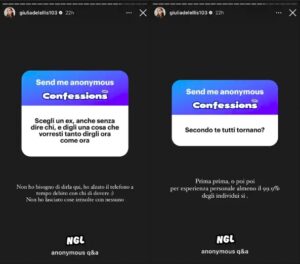 Qualcuno ha chiesto a Giulia De Lellis di scegliere un suo ex, anche senza fare il nome, e dirgli qualcosa. L’influencer ha risposto però dicendo di non aver bisogno di dirlo pubblicamente: “Ho alzato il telefono a tempo debito con chi di dovere. Non ho lasciato cose irrisolte con nessuno”, ha specificato subito. A chi le domanda invece se, secondo lei, tutti tornano, lei si dice sicura di sì: “Prima prima o poi poi, per esperienza personale, almeno il 99,9% degli individui sì”, ha dichiarato.
