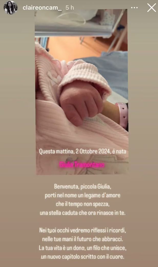 “Benvenuta piccola Giulia. Porti nel nome un legame d’amore che il tempo non spezza, una stella caduta che ora rinasce in te. Nei tuoi occhi vedremo riflessi i ricordi, nelle tue mani il futuro che abbracci. La vita è un dono, un filo che unisce, un nuovo capitolo scritto con il cuore”.
