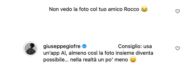 A vincere The Traitors Italia tuttavia è stato proprio Giuseppe Giofrè, che è riuscito a far fuori anche la Pollio. Dopo la fine del programma però pare che le frizioni tra il ballerino e Rocco Tanica non siano ancora concluse. In questi giorni infatti il cast sta promuovendo insieme ad Alessia Marcuzzi la trasmissione. Il ballerino e il comico, come hanno notato in molti, non si sono mai mostrati insieme e in queste ore un utente, commentando una foto di Giofrè, ha affermato: “Non vedo la foto col tuo amico Rocco”. Pronta la replica di Giuseppe che, alimentando i gossip in merito a presunti screzi con Rocco, ha aggiunto: “Consiglio: usa un’app AI, almeno così la foto insieme diventa possibile… nella realtà un po’ meno”.