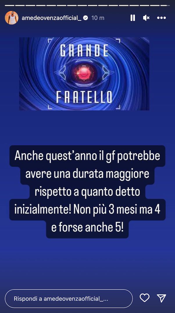 Stando a quanto ha rivelato Amedeo Venza, pare che anche quest’anno il Grande Fratello potrebbe allungarsi, e avere una durata di 4 o 5 mesi, a differenza di quanto comunicato in precedenza. Naturalmente precisiamo che al momento si tratta solo di rumor e di voci di corridoio, e a oggi nessuna conferma è giunta da parte dei vertici Mediaset e dai canali ufficiali del programma.