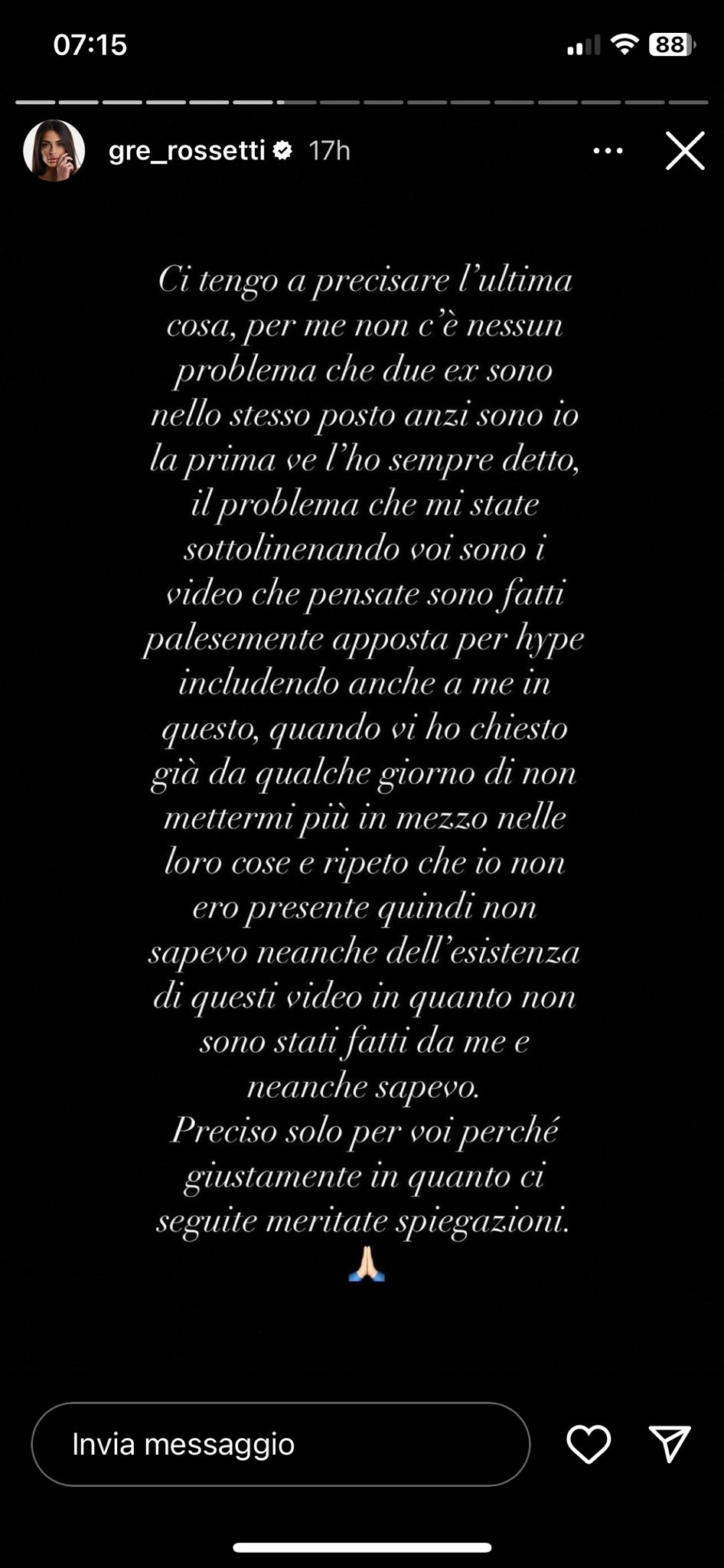 Successivamente ha parlato di alcuni messaggi ricevuti sui social che le segnalavano la presenza del fidanzato e della sua ex fidanzata alla stessa sfilata a Milano in occasione della Fashion Week: