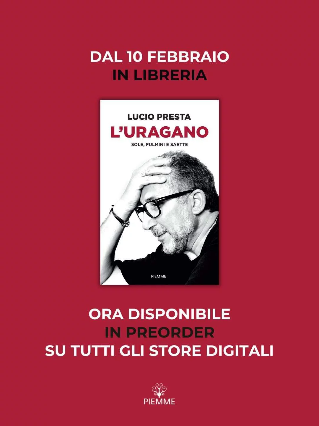 Il titolo del volume di Lucio Presta, edito da Piemme, è “L’Uragano – Sole, fulmini e saette” e uscirà il 10 febbraio in tutte le librerie. Già da ora è disponibile in preorder su tutti gli store digitali autorizzati.