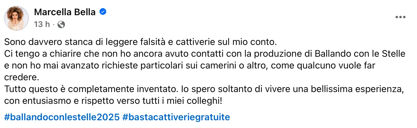 “Sono davvero stanca di leggere falsità e cattiverie sul mio conto. Ci tengo a chiarire che non ho ancora avuto contatti con la produzione di Ballando con le Stelle e non ho mai avanzato richieste particolari sui camerini o altro, come qualcuno vuole far credere. Tutto questo è completamente inventato. Io spero soltanto di vivere una bellissima esperienza, con entusiasmo e rispetto verso tutti i miei colleghi”.