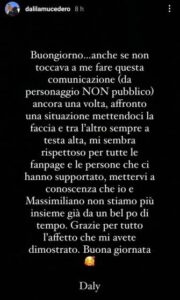 “Buongiorno… anche se non toccava a me fare questa comunicazione (da personaggio NON pubblico) ancora una volta affronto una situazione mettendoci la faccia e tra l’altro sempre a testa alta”, ha esordito l’ex di Massimiliano Morra. Per poi rivelare: Mi sembra rispettoso per tutte le fanpage e le persone che ci hanno supportato, mettervi a conoscenza che io e Massimiliano non stiamo più insieme già da un bel po’ di tempo. Grazie per tutto l’affetto che mi avete dimostrato