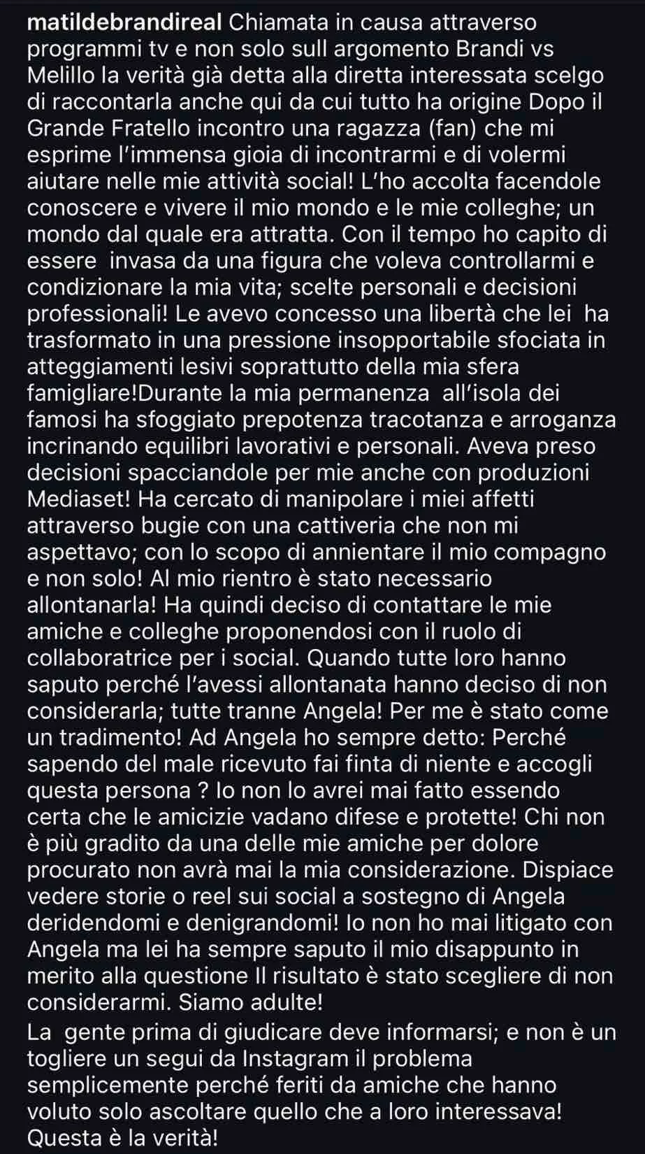 In sostanza, come potete leggere nello screen sottostamte, Matilde Brandi ha rivelato come dopo il Grande Fratello una sua fan voleva aiutarla nelle sue attività social. Lei l’ha accolta ma a quanto pare questa persona avrebbe avuto dei secondi fini, creandole problemi in famiglia e non solo. Peraltro pare che questa persona si sarebbe permessa di parlare a nome suo quando Matilde era impegnata a L’Isola.
