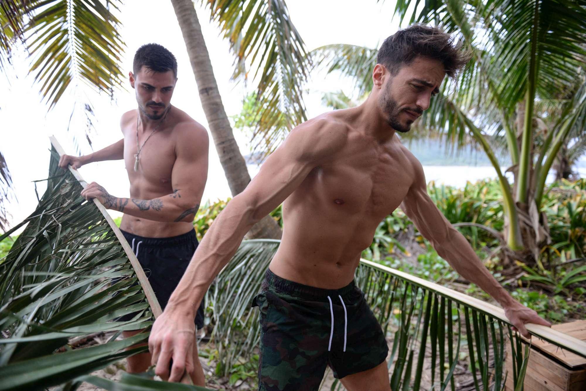 Marco Ferri, Francesco Monte e Amaurys Pérez fanno una certa figura mentre tagliano la legna cercando di ripararsi dalle intemperie come dei primitivi. Ed è proprio vero: sono solo in costume. Più slim per Perez e modello boxer per gli altri boys.