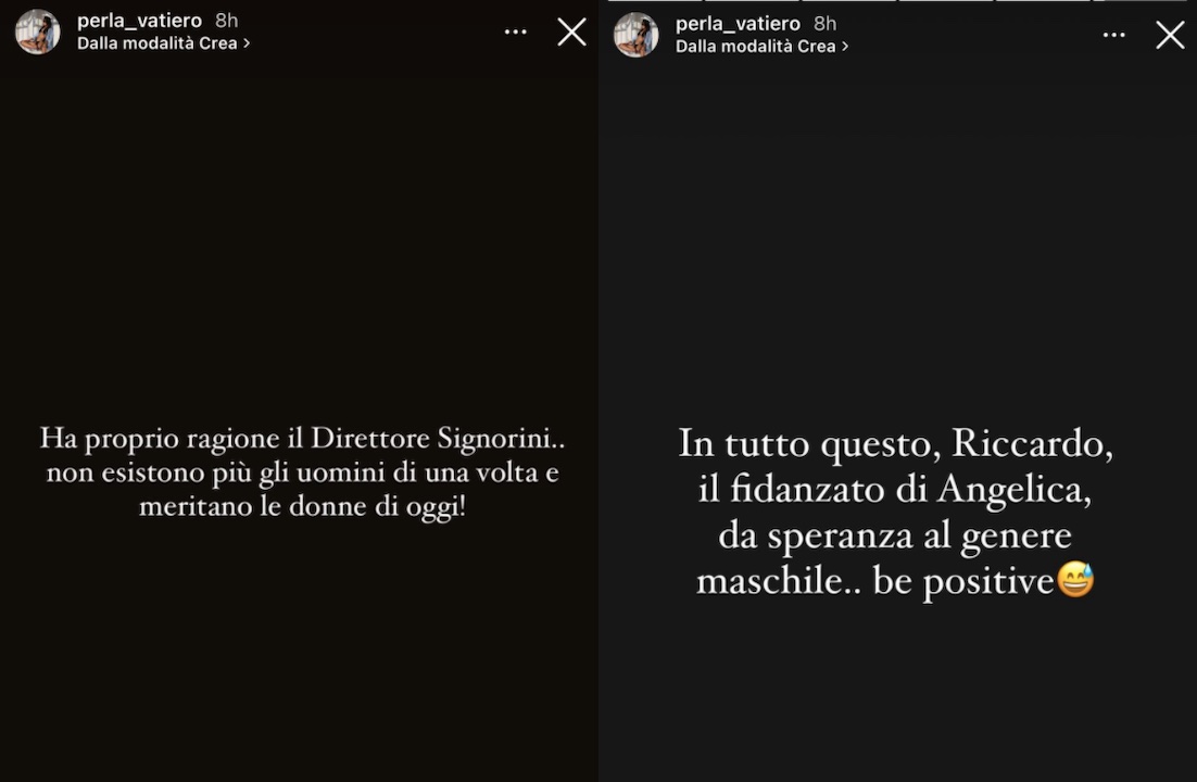 Dopo il confronto tra Greta Rossetti e Angelica Baraldi al GF, le parole del fidanzato della gieffina e il faccia a faccia tra Greta e Mirko Brunetti, poteva mai mancare il commento a caldo dell’ex Perla Vatiero? Ovvio che no! Sui social ha pubblicato due storie: “Ha proprio ragione il Direttore Signorini. Non esistono più gli uomini di una volta e meritano le donne di oggi! In tutto questo Riccardo, il fidanzato di Angelica, dà speranza al genere maschile… be positive”.