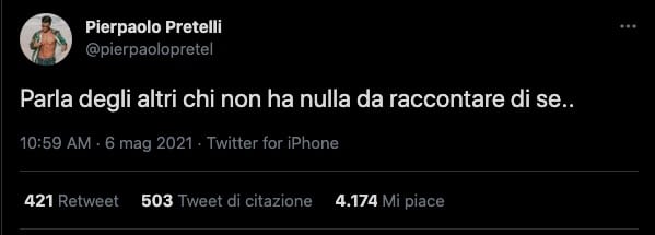 “Parla degli altri chi non ha nulla da raccontare di sé”. Una frase piuttosto diretta quella di Pierpaolo, che ha trovato d’accordo i suoi fan, i quali sembrano aver capito subito a cosa fosse riferito questo suo sfogo.