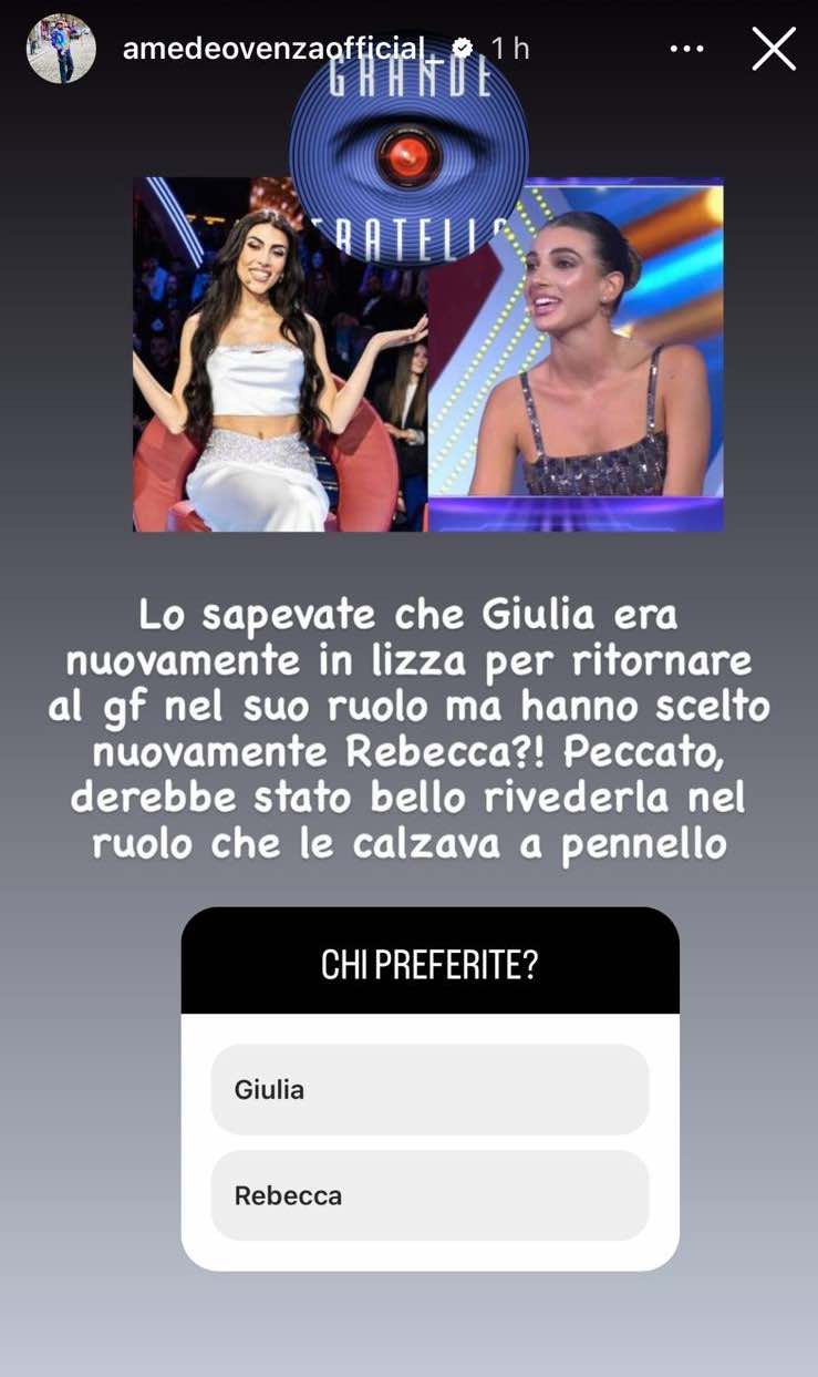 Queste le sue parole: “Lo sapevate che Giulia Salemi era nuovamente in lizza per ritornare al Grande Fratello nel suo ruolo, ma hanno scelto nuovamente Rebecca Staffelli? Peccato, sarebbe stato bello rivederla nel ruolo che le calzava a pennello”