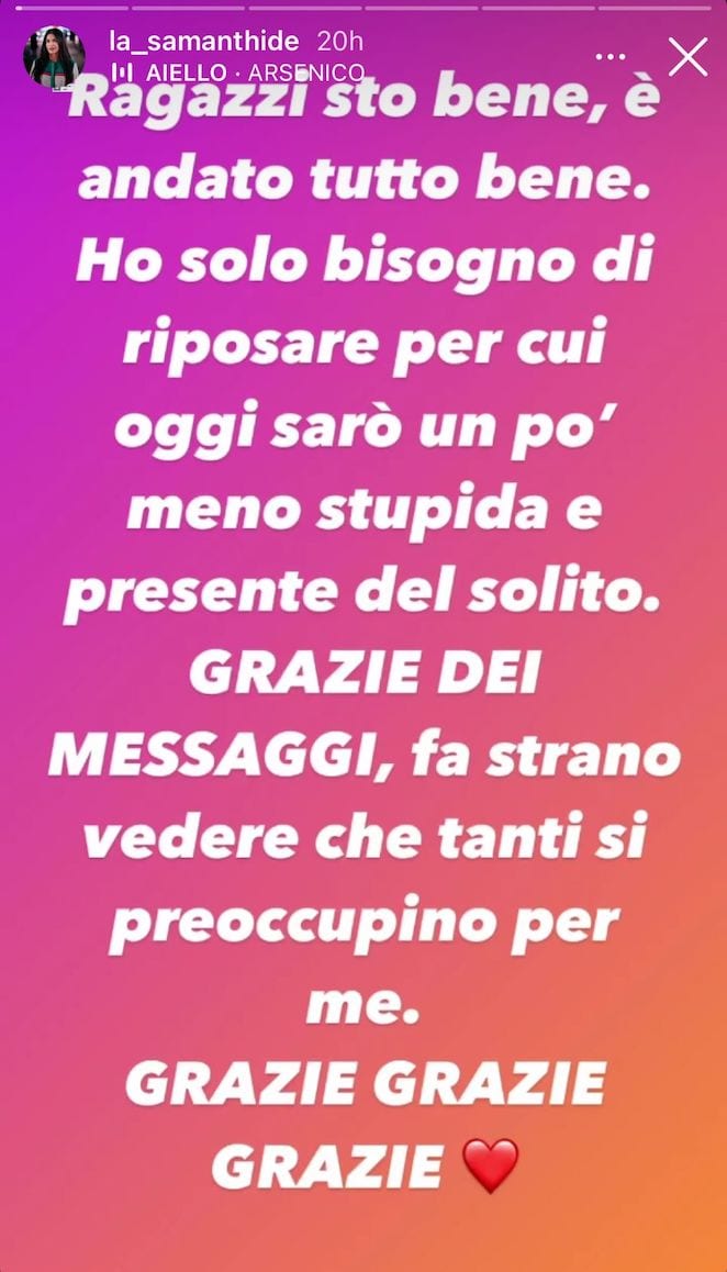 Poco dopo come se non bastasse Samantha Curcio è intervenuta nuovamente, facendo chiarezza sull’intervento. L’ex tronista ha ribadito di aver rimosso tre cisti, e non di essersi operata al cuore, come alcuni siti hanno riportato. Ma non solo. L’influencer ha ammesso di stare bene, pur sentendosi stanca e nervosa. Queste le sue dichiarazioni in merito: