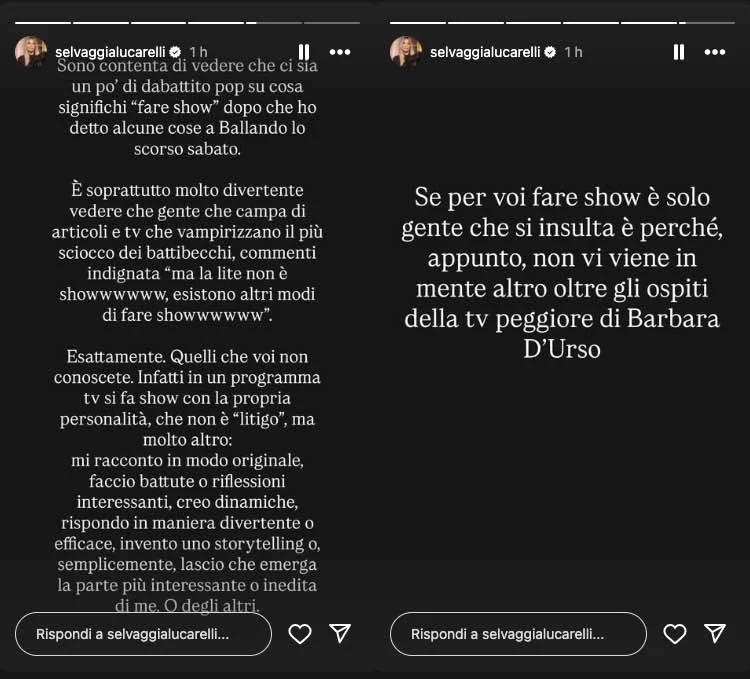 «Sono contenta di vedere che ci sia un po’ di dibattito pop su cosa significhi “fare show” dopo che ho detto alcune cose a Ballando lo scorso sabato. È soprattutto molto divertente vedere che gente che campa di articoli e tv che vampirizzano il più sciocco dei battibecchi, commenti indignata “ma la lite non è showwwwww, esistono altri modi di fare showwwwww”».