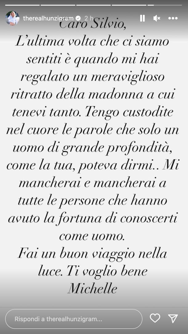 “Caro Silvio, l’ultima volta che ci siamo sentiti è quando mi hai regalato un meraviglioso ritratto della Madonna a cui tenevi tanto. Tengo custodite nel cuore le parole che solo un uomo di grande profondità, come la tua, poteva dirmi. Mi mancherai e mancherai a tutte le persone che hanno avuto la fortuna di conoscerti come uomo. Fai un buon viaggio nella luce. Ti voglio bene. Michelle”.