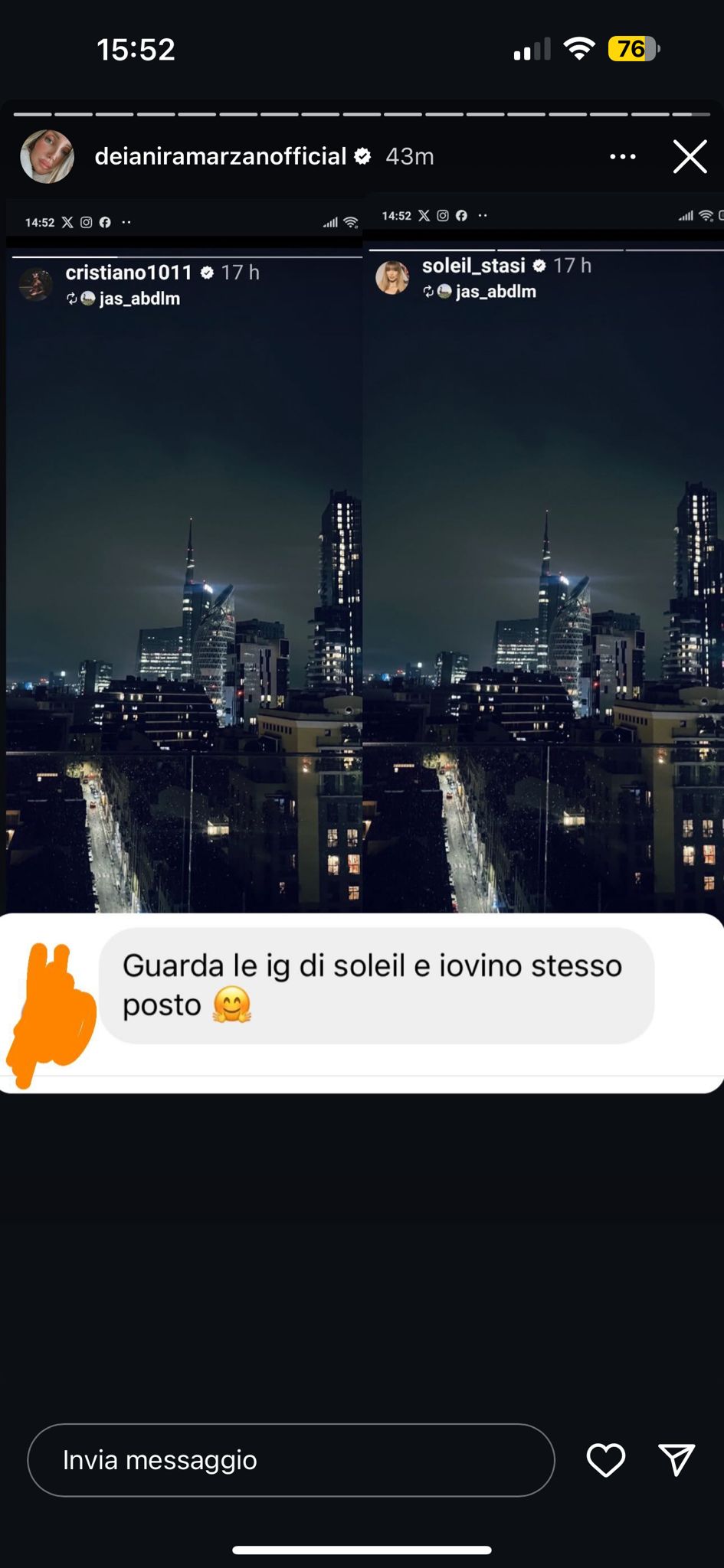 Deianira Marzano, sul proprio profilo Instagram, ha pubblicato la segnalazione di una sua follower. Questa persona ha notato che, a distanza di pochi minuti, Soleil Sorge e Cristiano Iovino hanno pubblicato la stessa identica immagine. Ai fan non è sfuggito un altro dettaglio: la medesima canzone di sottofondo. Tutti ora cominciano a chiedersi se tra loro possa esserci del tenero.