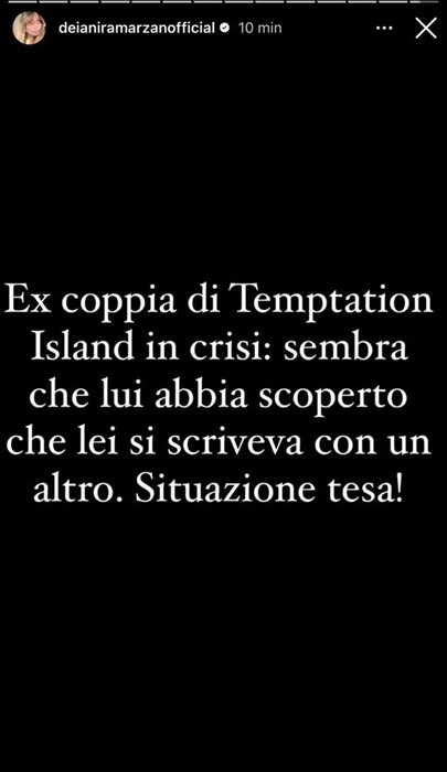 A rivelare tutto è Deianira Marzano che sul suo profilo Instagram ha scritto: “Ex coppia di Temptation Island in crisi: sembra che lui abbia scoperto che lei si scriveva con un altro. Situazione tesa! Lei dice di aver bisogno di una pausa di riflessione, avrà conosciuto un altro?”. Poco dopo sono spuntate anche le iniziali di questa coppia, cioè S e M. E a questo ha aggiunto che si vocifera di “corna” per lui, quindi lei lo avrebbe tradito.