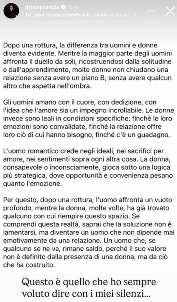 Alcuni giorni fa Jenny Guardiano ha presentato il suo nuovo fidanzato, Giovanni. Non è ovviamente mancata la reazione dell’ex Tony Renda e tra i due è partito l’ennesimo botta e risposta. Adesso, come se non bastasse, il dj è tornato a lanciare una frecciata alla sua ex compagna, dopo aver pubblicato un lunghissimo post sui suoi profili. Questo quanto si legge in merito: