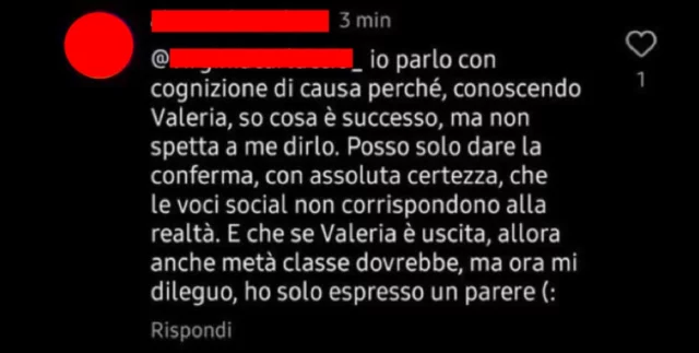 “Io parlo con cognizione di causa perché, conoscendo Valeria, so cosa è successo, ma non spetta a me dirlo”, ha esordito fin da subito questa persona che pare conoscere molto bene Valeria Mancini. A seguire ha aggiunto ancora: “Posso solo dare la conferma, con assoluta certezza, che le voci social non corrispondono alla realtà. E che se Valeria è uscita, allora anche metà classe dovrebbe. Ma ora mi dileguo, ho solo espresso un parere”. Si tratta di un punto di vista che non si può prendere per ufficiale.