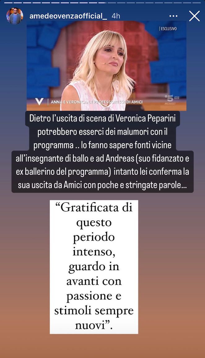 Non ha scritto altro Veronica Peparini, ma i suoi fan ci hanno tenuto comunque a mostrarle vicinanza e manifestato dispiacere nel caso in cui quest’ultima non dovesse essere davvero confermata come si dice. Sono emersi, tra l’altro anche i presunti motivi di questo abbandono alla trasmissione. Secondo quanto scritto da Amedeo Venza si sarebbe verificato qualche malumore: “Dietro l’uscita di scena di Veronica Peparini potrebbero esserci dei malumori con il programma. Lo fanno sapere fonti vicine all’insegnante di ballo e ad Andreas (suo fidanzato e ex ballerino del programma)”.